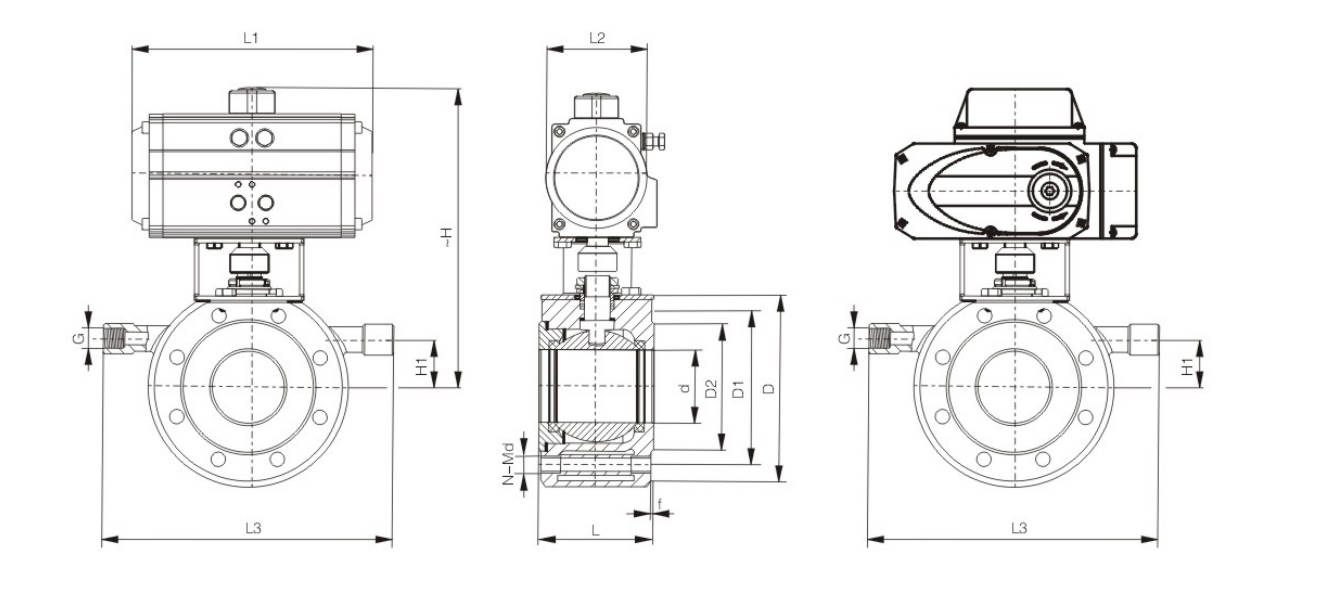 | DN | d | L | L1 | L2 | L3 | ~H | H1 | D | D1 | D2 | f | G | N-Md | Pneumatic Actuator Model | Electric Actuator Models |
