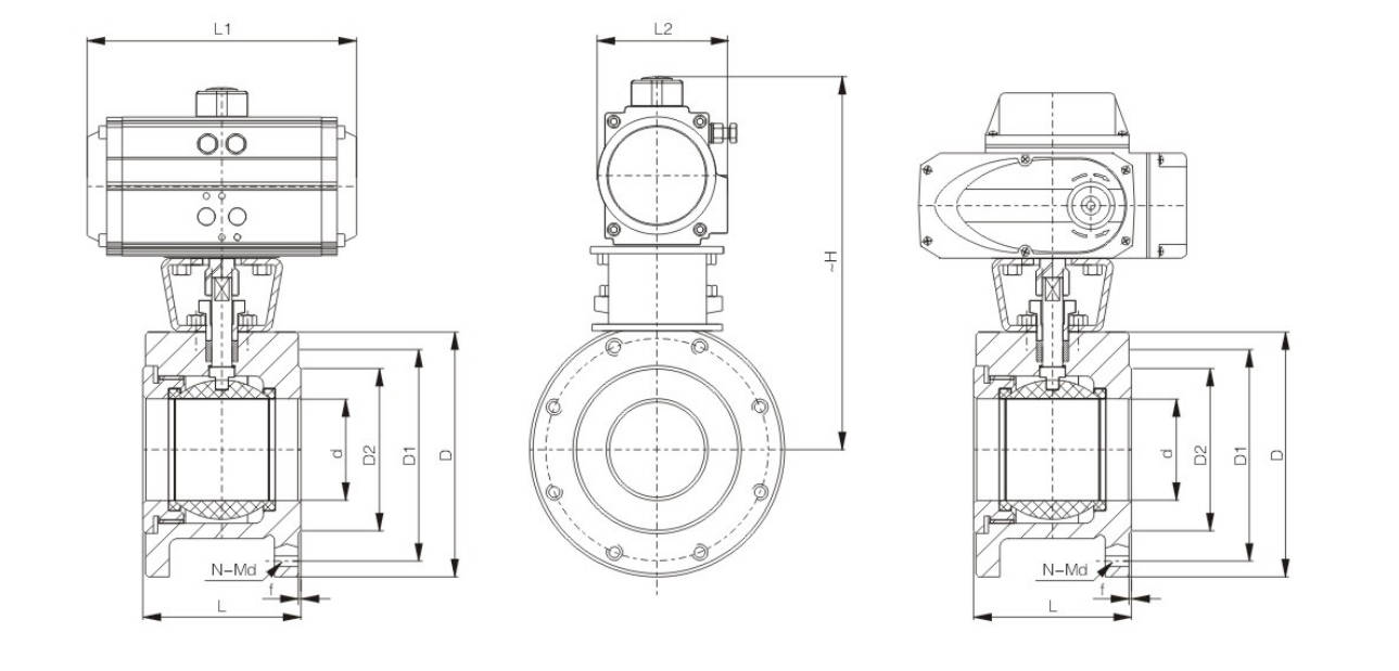 | DN | d | L | L1 | L2 | ~H | D | D1 | D2 | f | N-Md | Pneumatic Actuator Model | Electric Actuator Models |