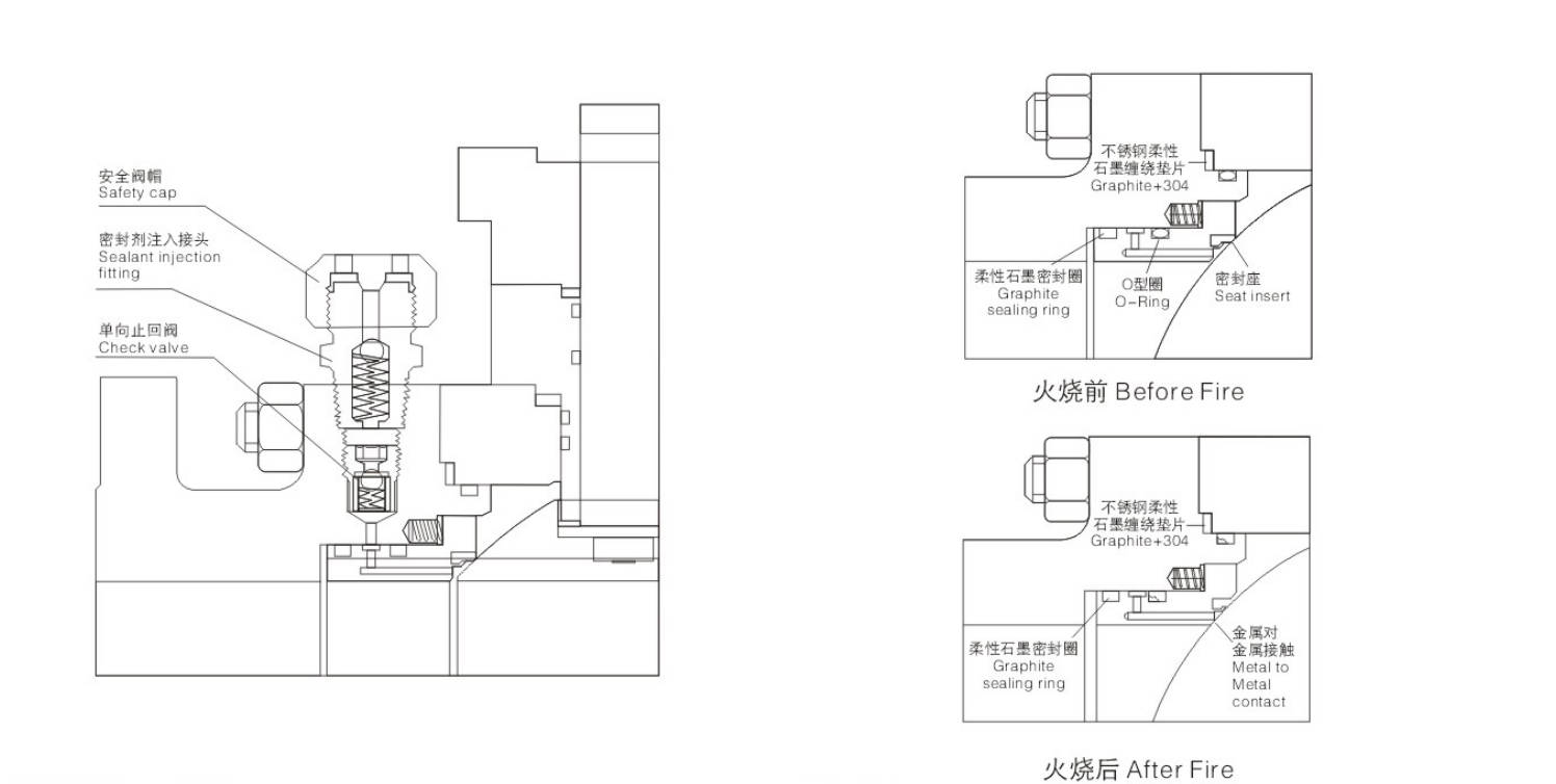 With the valve heated in a fire application, the nonmetal material parts such as seat sealing ring of PTFE, O-ring for the stem, and sealing gasket for body and bonnet, might be damaged due to high temperature. special design of auxiliary metal to metal or the graphite seal is provided for the trunnion ball valve to effectively prevent both internal and external leakage of the valve.