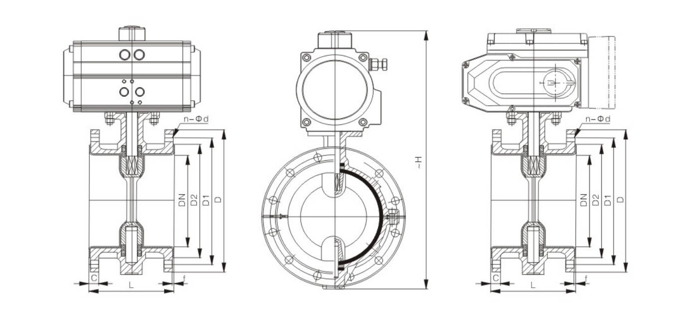 | DN | inch | L | D | D1 | D2 | f | b | n-Φd | H | Pneumatic Actuator Model | Electric Actuator Models |