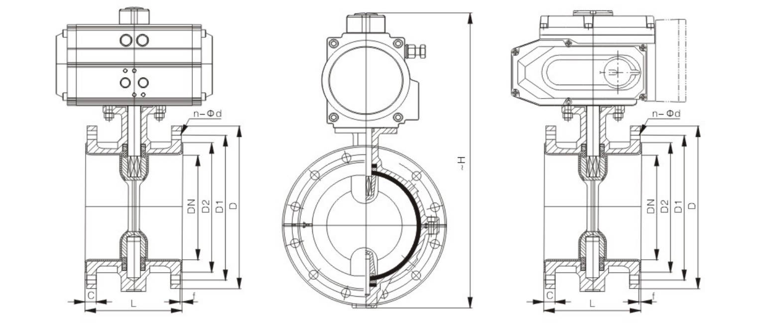| DN | L | D | D1 | D2 | C | f | n-Φd | ~H | Pneumatic Actuator Model | Electric Actuator Models |