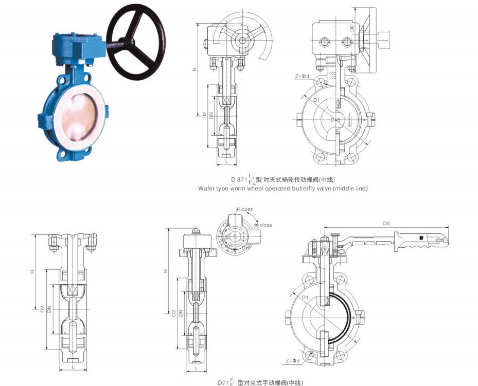 (1).The basic types include ZTD671F4 and ZTD671F46 (center-line) fully lined wafer-type butterfly valves. The valve body adopts a two-piece split structure, and the valve seat is integrally lined with the valve body. During operation, only the fully lined plastic seat and the butterfly disc come into contact with the medium. The valve can withstand corrosion from almost all media (except molten metal and elemental fluorine).