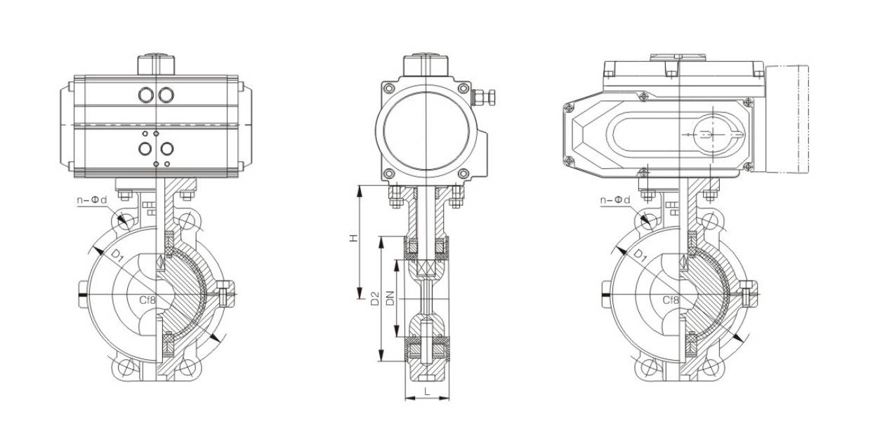 | DN | inch | L | D | D1 | D2 | n-Φd | H | Pneumatic Actuator Model | Electric Actuator Models |
