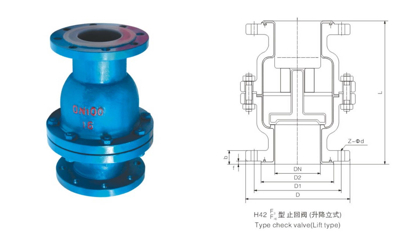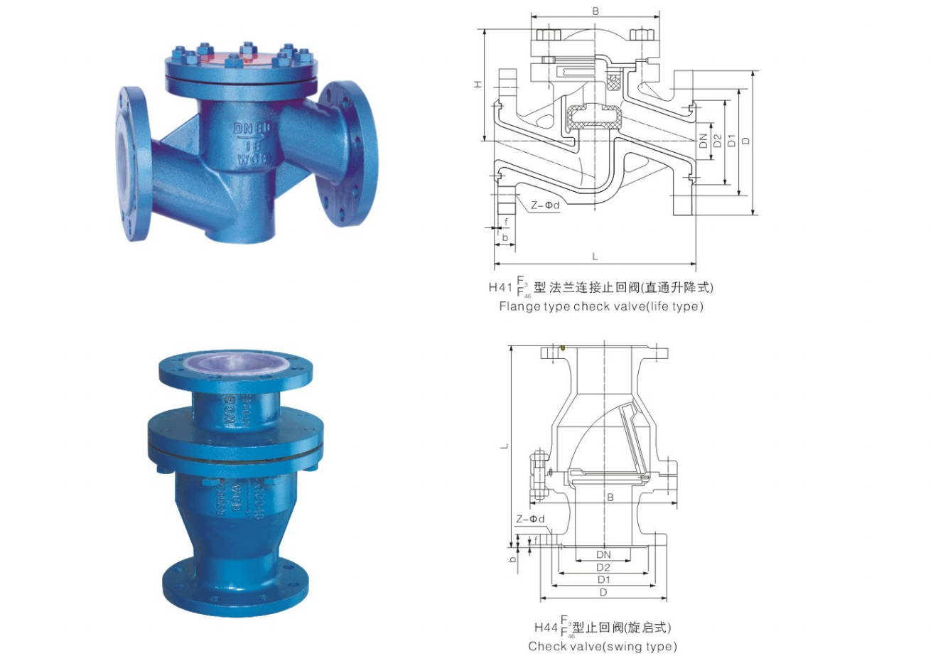 • Lift check valve: main types include H40F46, H42F46, and H72F46. Among them, H40F46 is a newer type with a semi-ball disc design. A common feature is that the fluoroplastic-lined disc moves up and down along the valve axis.