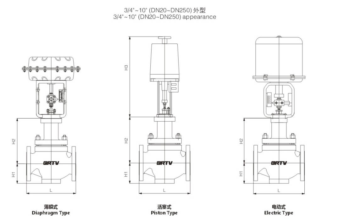 | DN (inch) | DN (mm) | L ANSI150 PN16/25 (GB/T12221) | L ANSI150 PN16/25 (GB/T17213.3) | L ANSI300 PN40 (GB/T17213.3) | L ANSI600 PN64/100 (GB/T17213.3) | H1 | H2 | H3 | Electrical Actuator | Pneumatic Actuator |