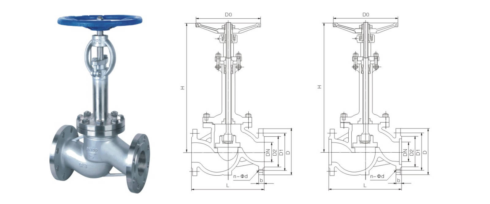| Type | DN | L | D | D1 | D2 | b | n-Φd | H (-46°C) | H (-101°C) | H (-196°C) | D0 |